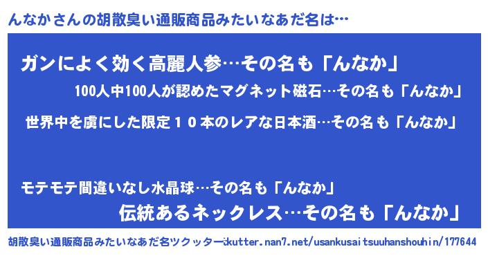 | 意味不明あだ名 | 『なめこ科んなか属』『自称んなか』 |