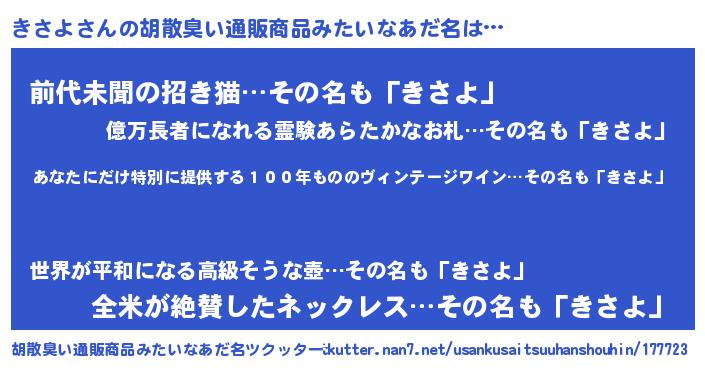 | ヘコむあだ名 | 『きさよ(小並感)』『きさお』『牛乳』 |