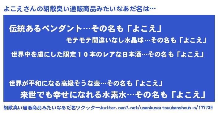 | 意味不明あだ名 | 『なめこ科よこえ属』『永久保存よこえ』 |