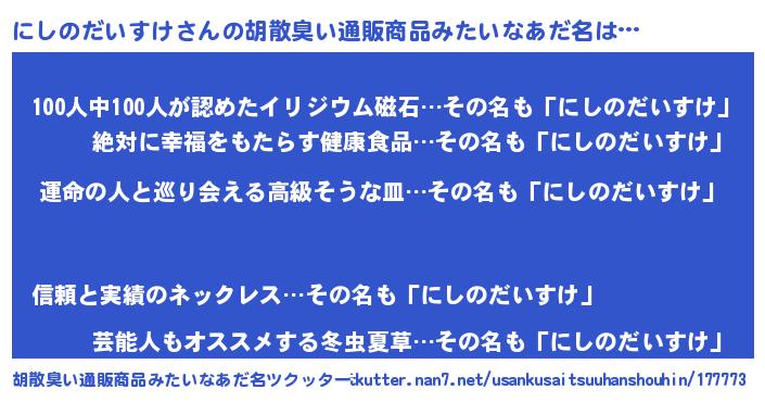 | 意味不明あだ名 | 『にしのだいすけフォーエバー』 |