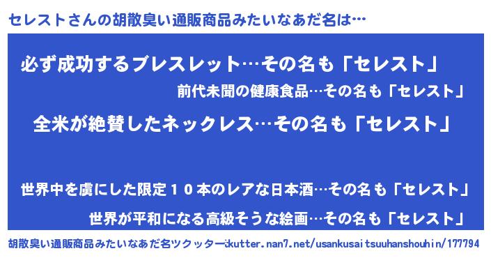 | 意味不明あだ名 | 『とにかく怪しいセレスト』 |