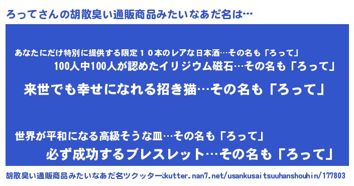 | ヘコむあだ名 | 『ろって(小並感)』『ろっもー』 |