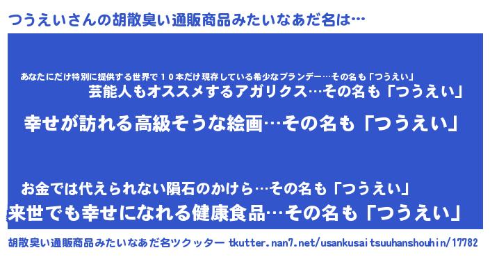 | 意味不明あだ名 | 『つうえいフォーエバー』『自称つうえい』 |