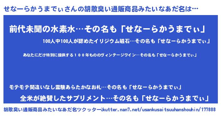| 意味不明あだ名 | 『住所不定無職せなーらかうまでぃ(8歳)』 |