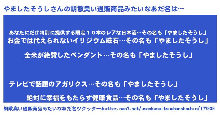 | 男性向けラノベタイトル風あだ名 | 『やましたそうしに滅ぼされるだけの簡単なお仕事です』 |