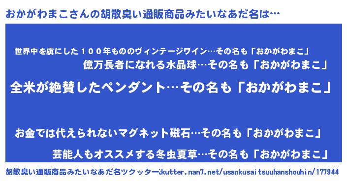 | 欧米人風あだ名 | 『おかがわまこ・ステッグマイヤー』 |