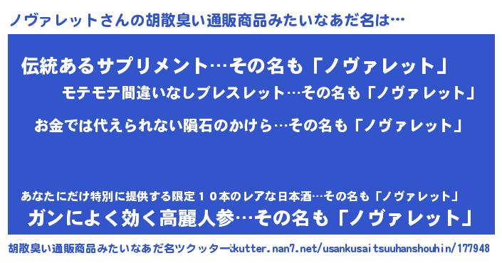 | 男性向けラノベタイトル風あだ名 | 『おまえをオタクにしてやるから、俺をノヴァレットにしてくれ! 』 |