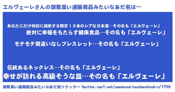| 男性向けラノベタイトル風あだ名 | 『転生したらエルヴェーレだった件』 |