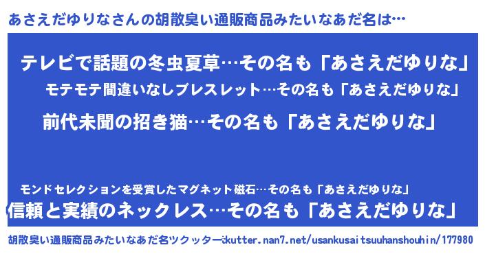 | ヘコむあだ名 | 『あさえだゆりな(笑)』『あさ太郎』 |