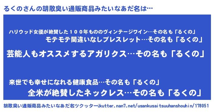 | 意味不明あだ名 | 『自称るくの』『住所不定無職るくの(1歳)』 |