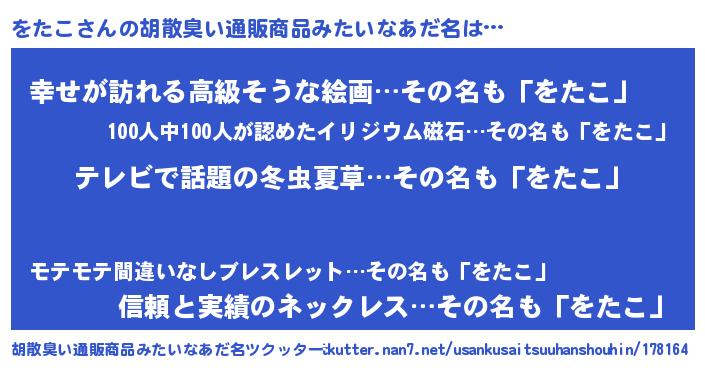 | 男性向けラノベタイトル風あだ名 | 『はたらくをたこさま!』『緋弾のヲタコ』 |