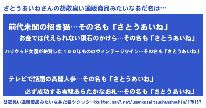 | ヘコむあだ名 | 『さとうあいね(笑)』『さとにー』 |