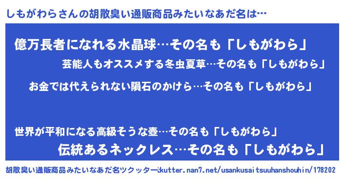 | 男性向けラノベタイトル風あだ名 | 『おまえをオタクにしてやるから、俺をしもがわらにしてくれ! 』 |