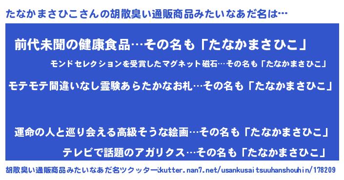 | ヘコむあだ名 | 『たなもー』『たなかまさひこ(震え声)』 |