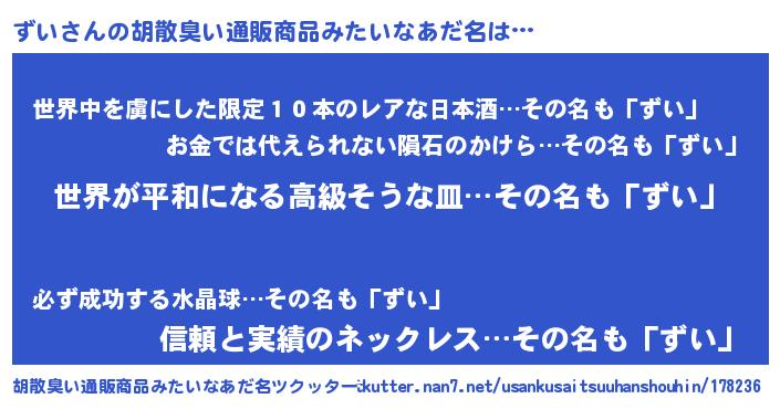 | 男性向けラノベタイトル風あだ名 | 『ずいに滅ぼされるだけの簡単なお仕事です』 |