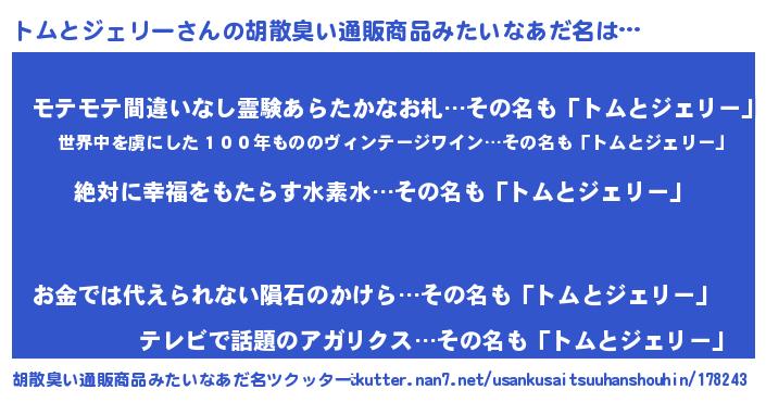 | 男性向けラノベタイトル風あだ名 | 『トムとジェリーという概念が存在しない退屈な世界 』 |