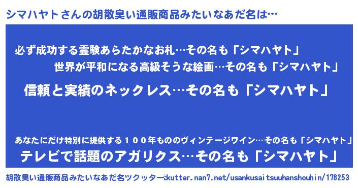 | 意味不明あだ名 | 『とにかく怪しいシマハヤト』 |