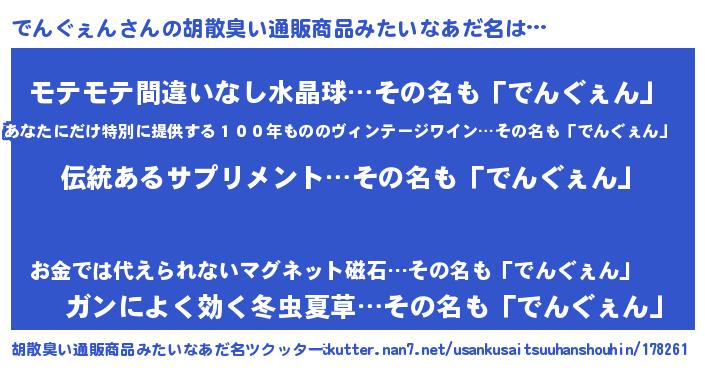| 男性向けラノベタイトル風あだ名 | 『でんぐぇんの嫁は女の子じゃないと思った?』 |