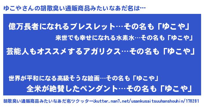 | 意味不明あだ名 | 『自称ゆこや』『ペロリンゆこや』 |