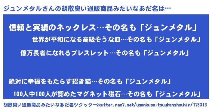 | 男性向けラノベタイトル風あだ名 | 『ジュンメタルアートオンライン』 |