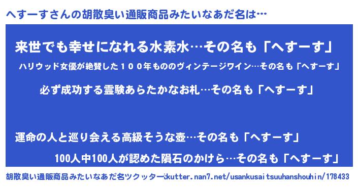 | 料理風あだ名 | 『へすーすごはん』『へすーすのトマト煮』 |