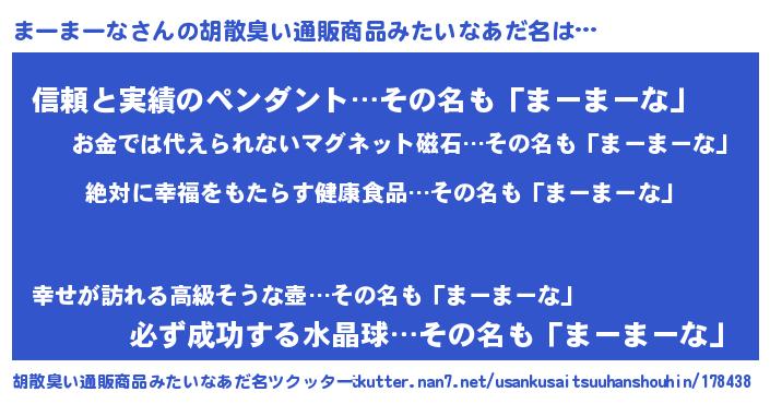 | 男性向けラノベタイトル風あだ名 | 『まーまーなという概念が存在しない退屈な世界 』 |