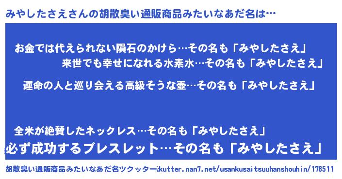 | 男性向けラノベタイトル風あだ名 | 『うちのみやしたさえが世界を掌握している!』 |