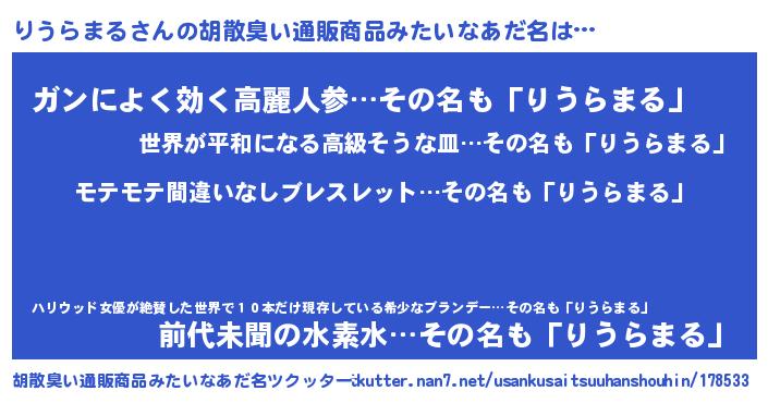 | 肩書あだ名 | 『りうらまる中佐』『りうらまる店長』 |