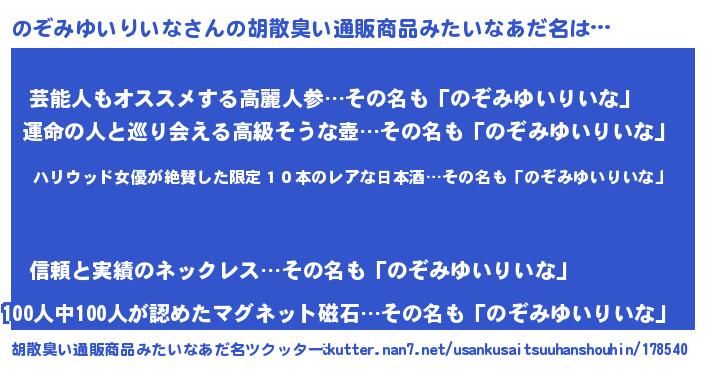 | 意味不明あだ名 | 『住所不定無職のぞみゆいりいな(53歳)』 |
