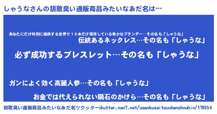 | 男性向けラノベタイトル風あだ名 | 『しゃうなの憂鬱』 |