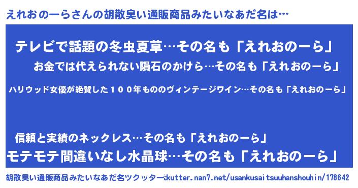 | 意味不明あだ名 | 『住所不定無職えれおのーら(6歳)』 |