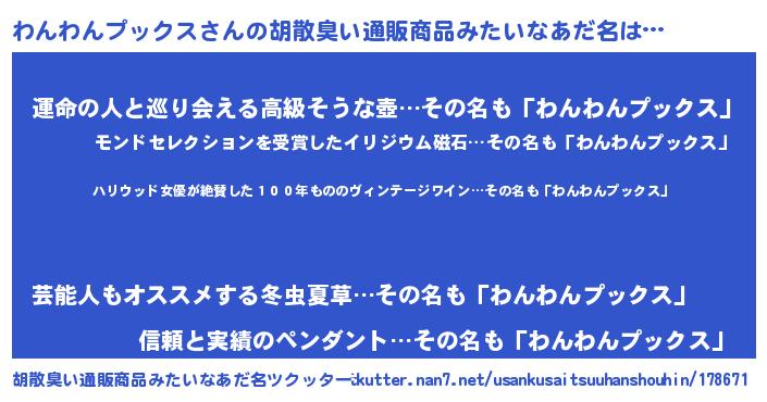 | ことわざ | 一石二鳥『一石二わんわんプックス』 |
