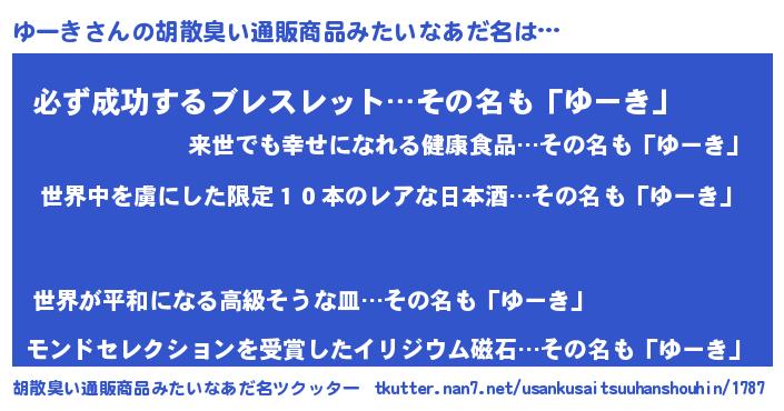 | 意味不明あだ名 | 『住所不定無職ゆーき(68歳)』 |