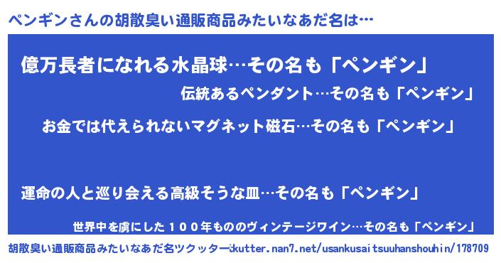 | 男性向けラノベタイトル風あだ名 | 『転生したらぺンギンだった件』 |