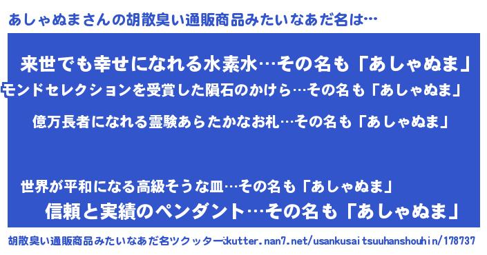 | 男性向けラノベタイトル風あだ名 | 『アシャヌマアートオンライン』 |