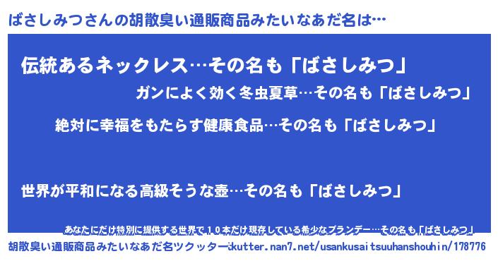 | 男性向けラノベタイトル風あだ名 | 『ばさしみつという概念が存在しない退屈な世界 』 |