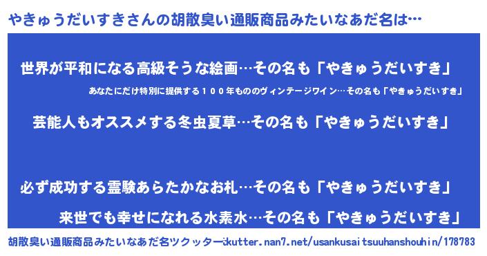 | 伝説のあだ名 | 『最強の陰陽師やきゅうだいすき』 |