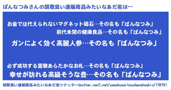 | 恥ずかしいあだ名 | 『バンナツミデラックス』『ばんっちょ』 |
