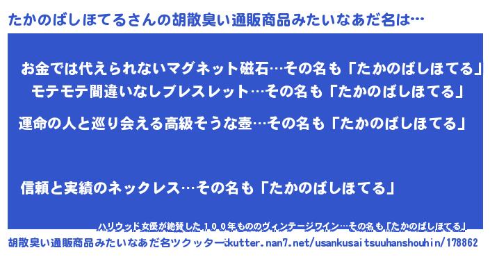 | 意味不明あだ名 | 『ヨモギ科たかのばしほてる属』 |