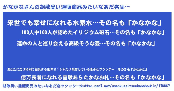 | 男性向けラノベタイトル風あだ名 | 『かなかな~年齢イコール彼女いない歴の魔法使い~』 |