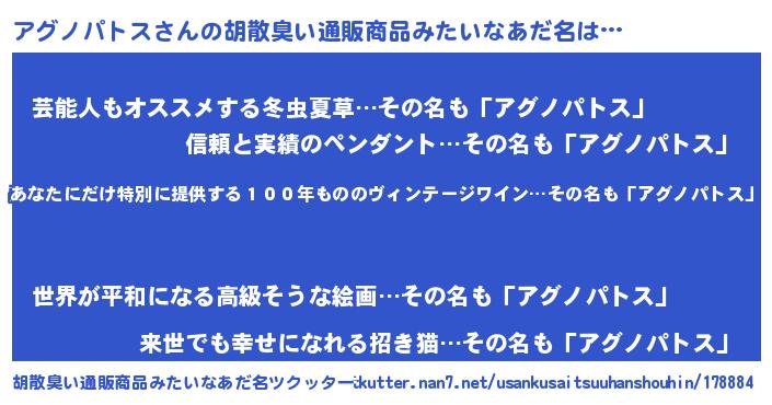 | 意味不明あだ名 | 『住所不定無職アグノパトス(5歳)』 |