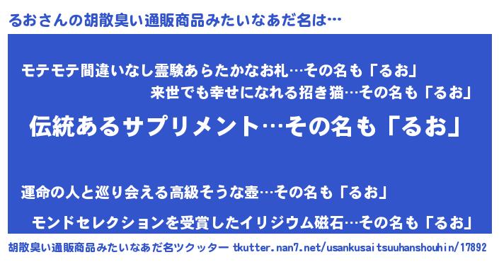 | 男性向けラノベタイトル風あだ名 | 『るおに滅ぼされるだけの簡単なお仕事です』 |