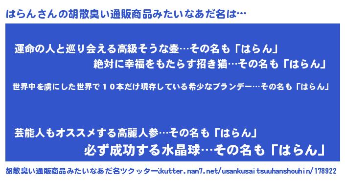 | 意味不明あだ名 | 『住所不定無職はらん(84歳)』『自称はらん』 |
