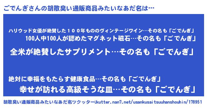 | 女子向けラノベタイトル風あだ名 | 『ごでんぎ様がみてる』『ごでんぎ恋絵巻』 |