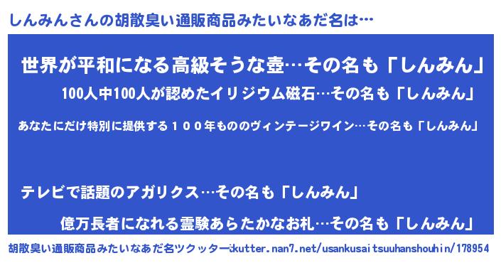 | 男性向けラノベタイトル風あだ名 | 『この素晴らしい世界にしんみんを!』 |