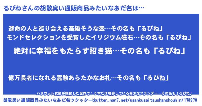 | 男性向けラノベタイトル風あだ名 | 『るぴねという概念が存在しない退屈な世界 』 |