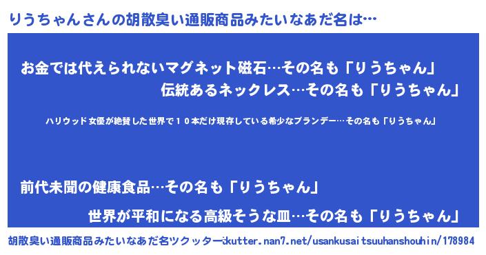 | 男性向けラノベタイトル風あだ名 | 『リウチャンスレイヤー』 |