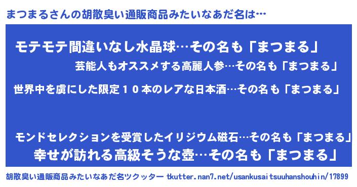 | 男性向けラノベタイトル風あだ名 | 『この素晴らしい世界にまつまるを!』 |