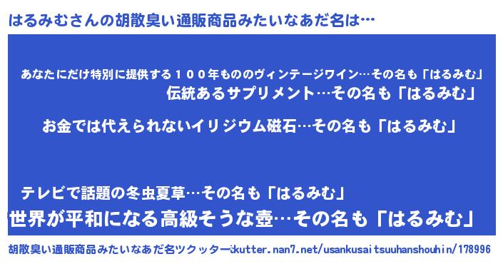 | ヘコむあだ名 | 『なまこ酢』『はるを』『はるにゅー』 |