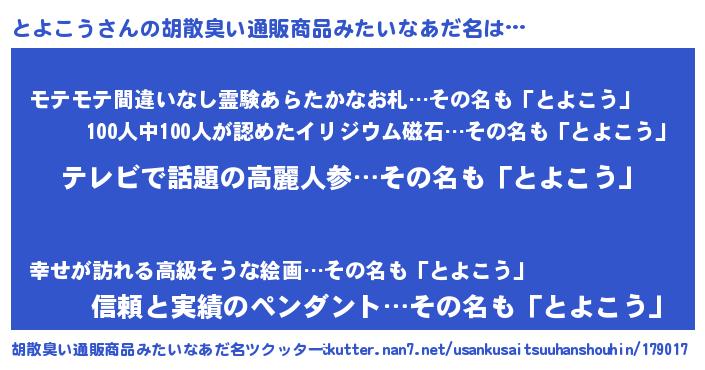 | 男性向けラノベタイトル風あだ名 | 『Re:とよこうから始める異世界生活』 |